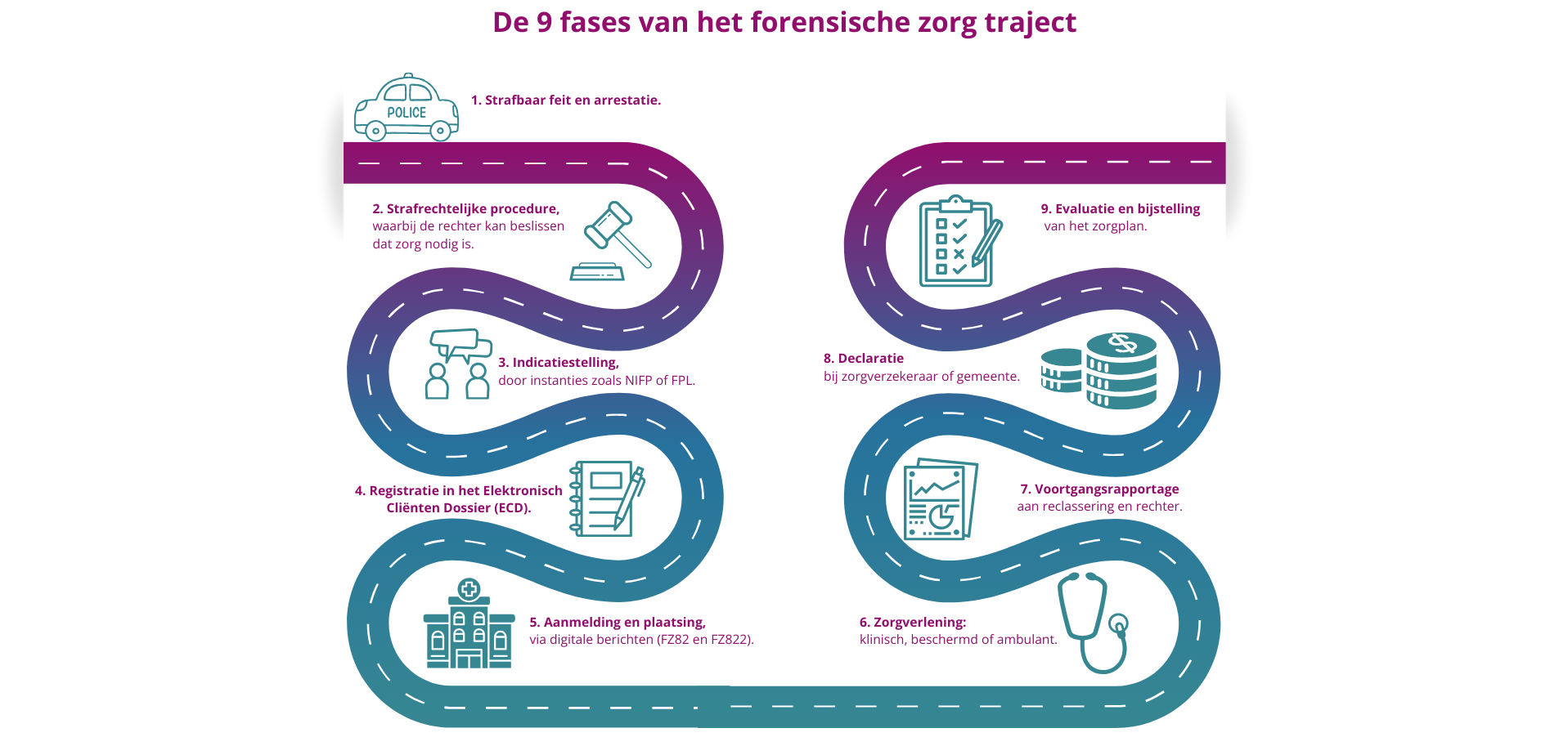Achter elk traject van forensische zorg schuilt een zorgvuldig opgebouwd proces. Vanaf het moment dat iemand een delict pleegt tot aan de evaluatie van het zorgplan volgen meerdere stappen: arrestatie, indicatiestelling door gespecialiseerde instanties, registratie in het Elektronisch Cliënten Dossier, aanmelding en plaatsing via het Forensisch Plaatsingsloket, daadwerkelijke zorgverlening, rapportages, declaraties en uiteindelijk de evaluatie.